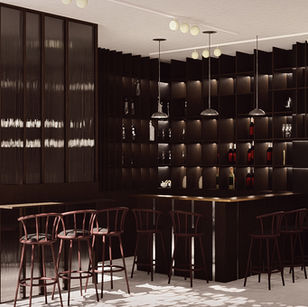 The interior balances warmth and restraint through textured plaster walls, dark wood millwork, and softly diffused lighting. Intimate seating areas and a central bar encourage gathering, while arched openings and layered shelving subtly reference vernacular Georgian architecture without relying on pastiche. Material contrasts between light and dark surfaces create depth and rhythm throughout the space.
